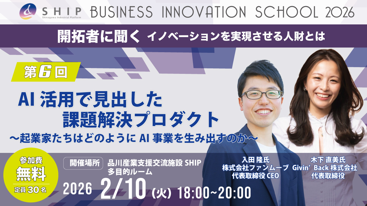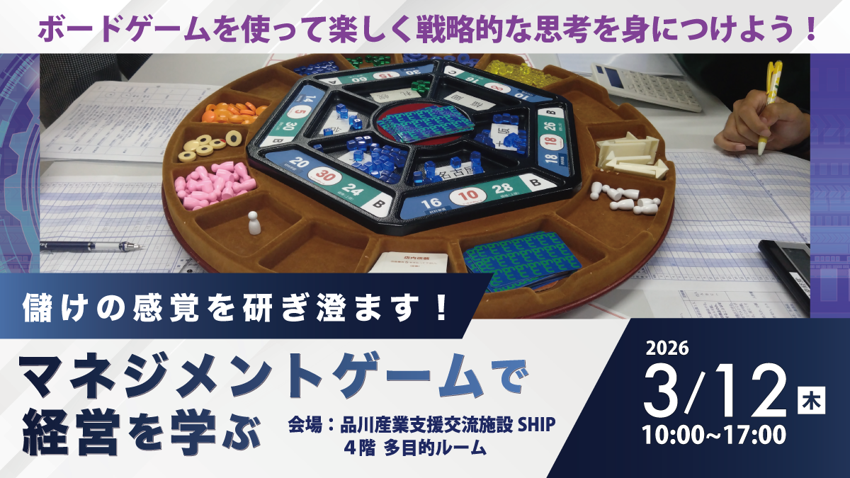 EVENT一覧へ 2026年1月30日 2026年3月12日(木)ボードゲームを使って楽しく戦略的な思考を身につけよう! マネジメントゲーム開催! 2026年1月27日 2月10日(火)ビジネスイノベーションスクールVol.6 開催! AI活用で見出した課題解決プロダクト~起業家たちはどのようにAI事業を生み出すのか~ 2026年1月22日 2月10日(火)小規模交流会SHIP Talk Salon開催!トップ営業でなくても成果が出る~再現性のあるBtoB営業のつくり方~