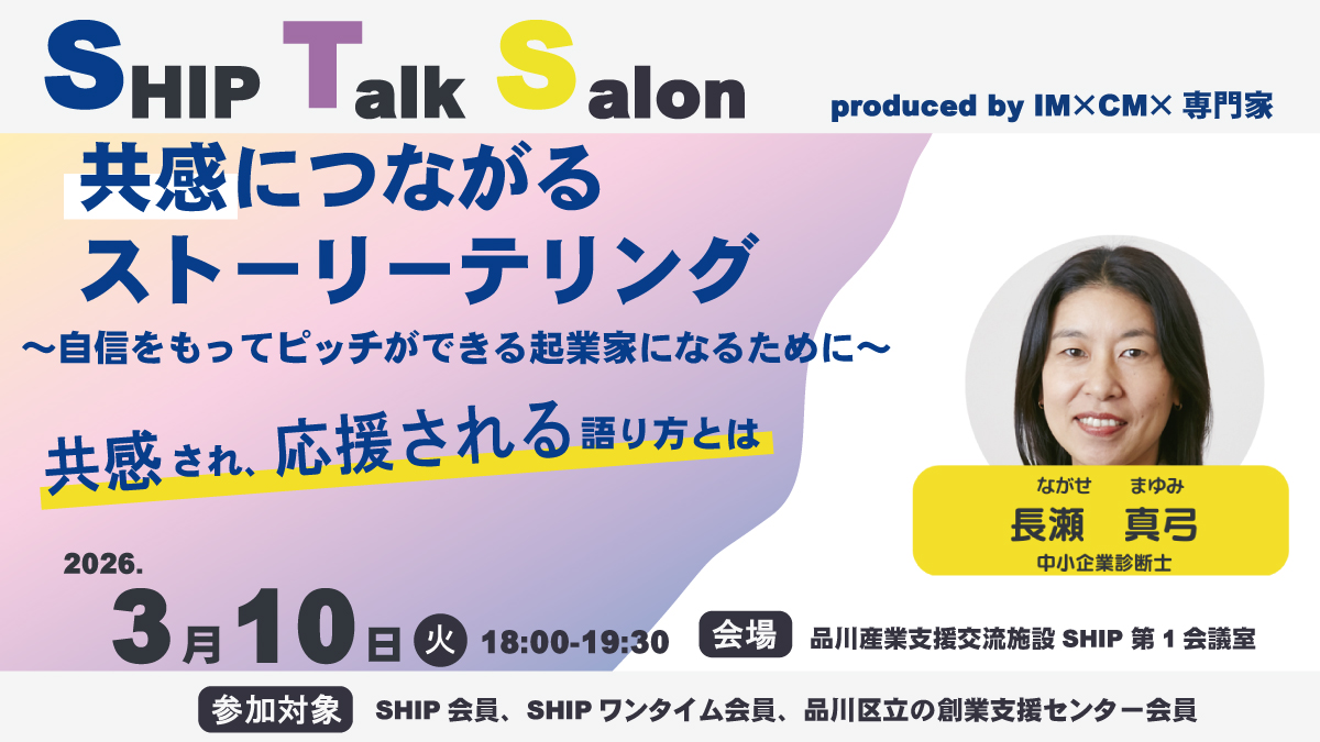 NEWS一覧へ 2026.02.17 3月10日(火)小規模交流会SHIP Talk Salon開催!共感につながるストーリーテリング~自信をもってピッチができる起業家になるために~ 2026.02.10 2026年3月12日(木)ボードゲームを使って楽しく戦略的な思考を身につけよう! マネジメントゲーム開催! 2026.02.02 2月25日(水)東商×公庫 合同経営相談会 in SHIP(東京商工会議所品川支部、日本政策金融公庫五反田支店 連携相談会) 2026.01.31 【2月】各士業の相談日程ご案内 2026.01.27 【終了】2月10日(火)ビジネスイノベーションスクールVol.6 開催! AI活用で見出した課題解決プロダクト~起業家たちはどのようにAI事業を生み出すのか~ 2026.01.26 【品川区事業】令和8年度「品川パビリオン」共同出展企業募集開始のお知らせ 2026.01.21 【終了】2月10日(火)小規模交流会SHIP Talk Salon開催!トップ営業でなくても成果が出る~再現性のあるBtoB営業のつくり方~ 2026.01.01 【1月】各士業の相談日程ご案内 2025.12.26 【終了】1月22日(木)開催!SHIP Creativity Day「2D図面→ 3D CAD生成AIの最前線」 2025.12.24 【1月】コミュニティマネージャーによるキャリアデザイン相談 開催のお知らせ
