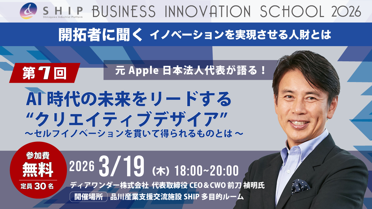 EVENT一覧へ 2026年2月20日 3月19日(木)ビジネスイノベーションスクールVol.7 開催! AI時代の未来をリードする“クリエイティブデザイア”~セルフイノベーションを貫いて得られるものとは~ 2026年1月30日 2026年3月12日(木)ボードゲームを使って楽しく戦略的な思考を身につけよう! マネジメントゲーム開催! 2026年1月29日 3月10日(火)小規模交流会SHIP Talk Salon開催!共感につながるストーリーテリング~自信をもってピッチができる起業家になるために~