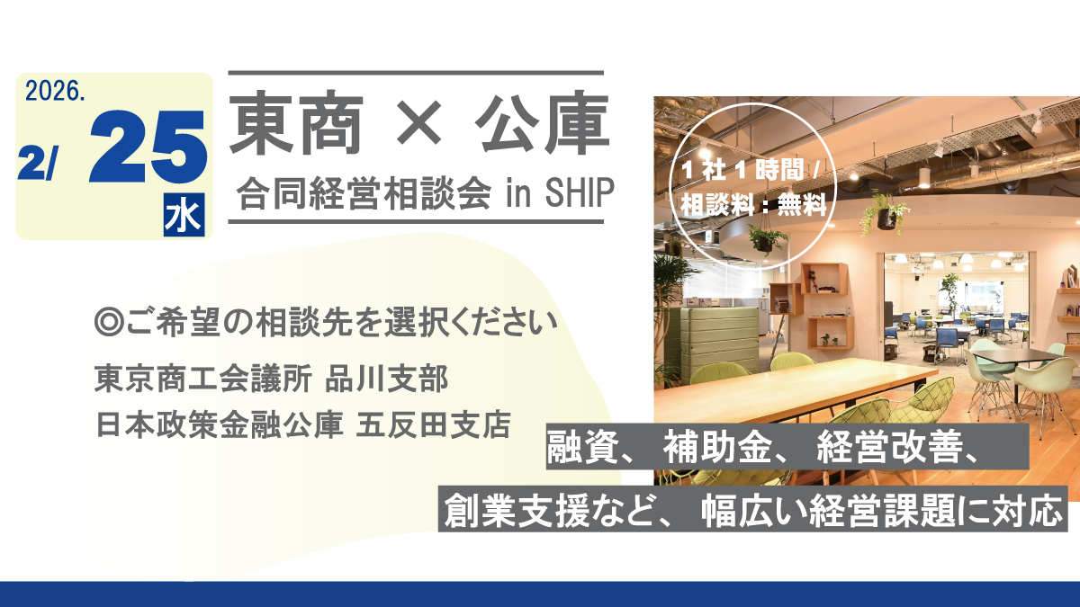NEWS一覧へ 2026.02.02 2月25日(水)東商×公庫 合同経営相談会 in SHIP(東京商工会議所品川支部、日本政策金融公庫五反田支店 連携相談会) 2026.01.31 【2月】各士業の相談日程ご案内 2026.01.27 2月10日(火)ビジネスイノベーションスクールVol.6 開催! AI活用で見出した課題解決プロダクト~起業家たちはどのようにAI事業を生み出すのか~ 2026.01.26 【品川区事業】令和8年度「品川パビリオン」共同出展企業募集開始のお知らせ 2026.01.21 2月10日(火)小規模交流会SHIP Talk Salon開催!トップ営業でなくても成果が出る~再現性のあるBtoB営業のつくり方~ 2026.01.01 【1月】各士業の相談日程ご案内 2025.12.26 【終了】1月22日(木)開催!SHIP Creativity Day「2D図面→ 3D CAD生成AIの最前線」 2025.12.24 【1月】コミュニティマネージャーによるキャリアデザイン相談 開催のお知らせ 2025.12.23 【終了】1月30日(金)東商×公庫 合同経営相談会 in SHIP(東京商工会議所品川支部、日本政策金融公庫五反田支店 連携相談会) 2025.12.19 【終了】2026年1月20日(火)小規模交流会SHIP Talk Salon開催!RPA超入門 ~事務作業を自動化して時間を生み出す方法~