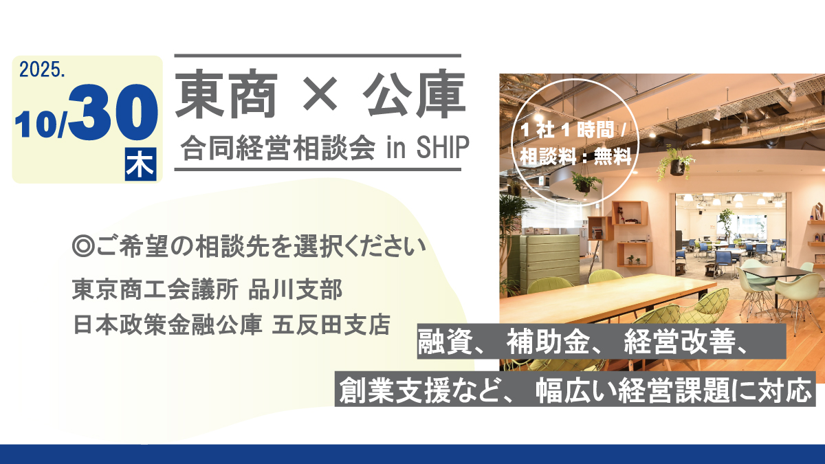 10月30日(木)東商×公庫 合同経営相談会 in SHIP(東京商工会議所品川支部、日本政策金融公庫五反田支店 連携相談会)