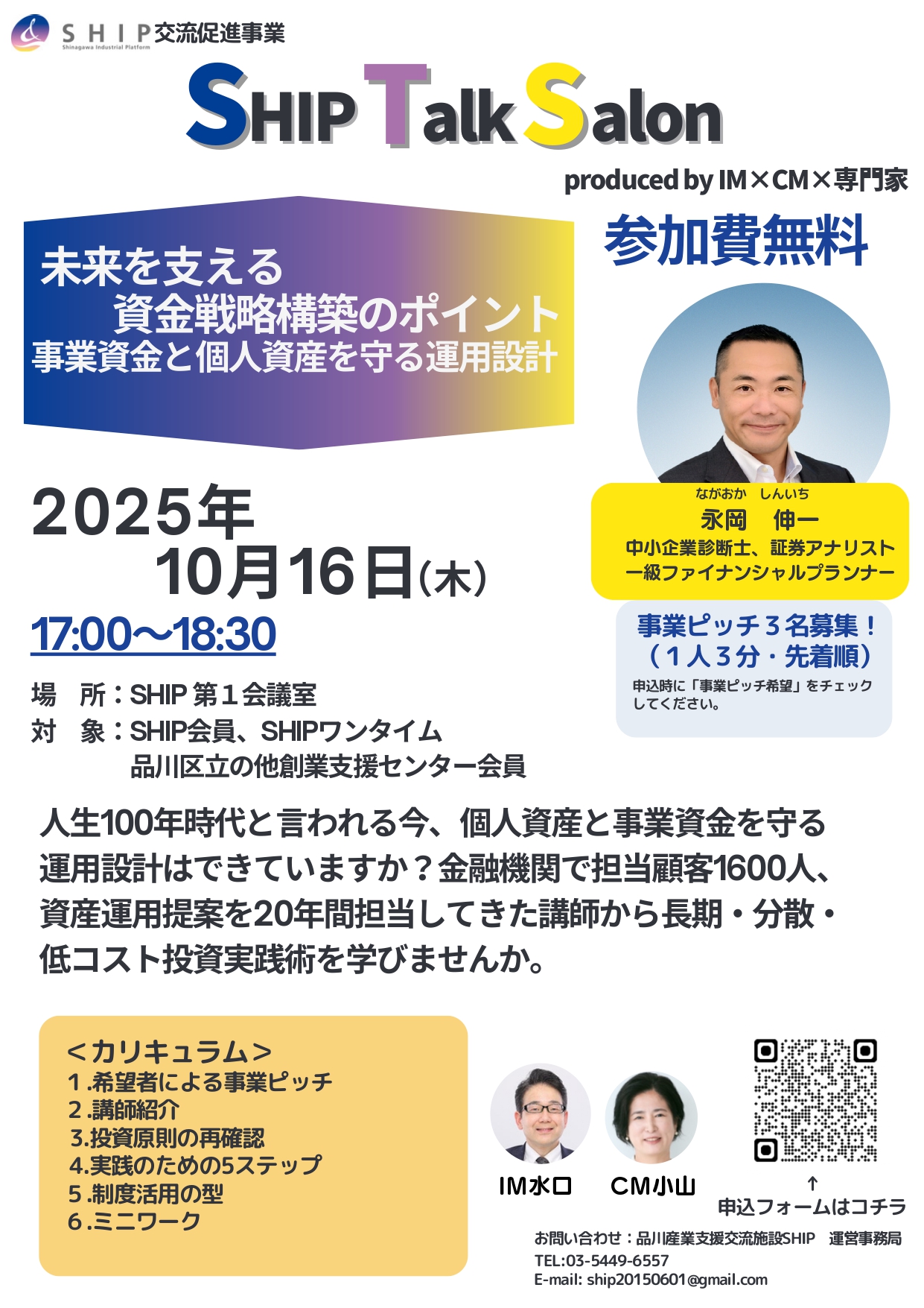 10月16日(木)小規模交流会SHIP Talk Salon開催!未来を支える 資金戦略構築のポイント 事業資金と個人資産を守る運用設計