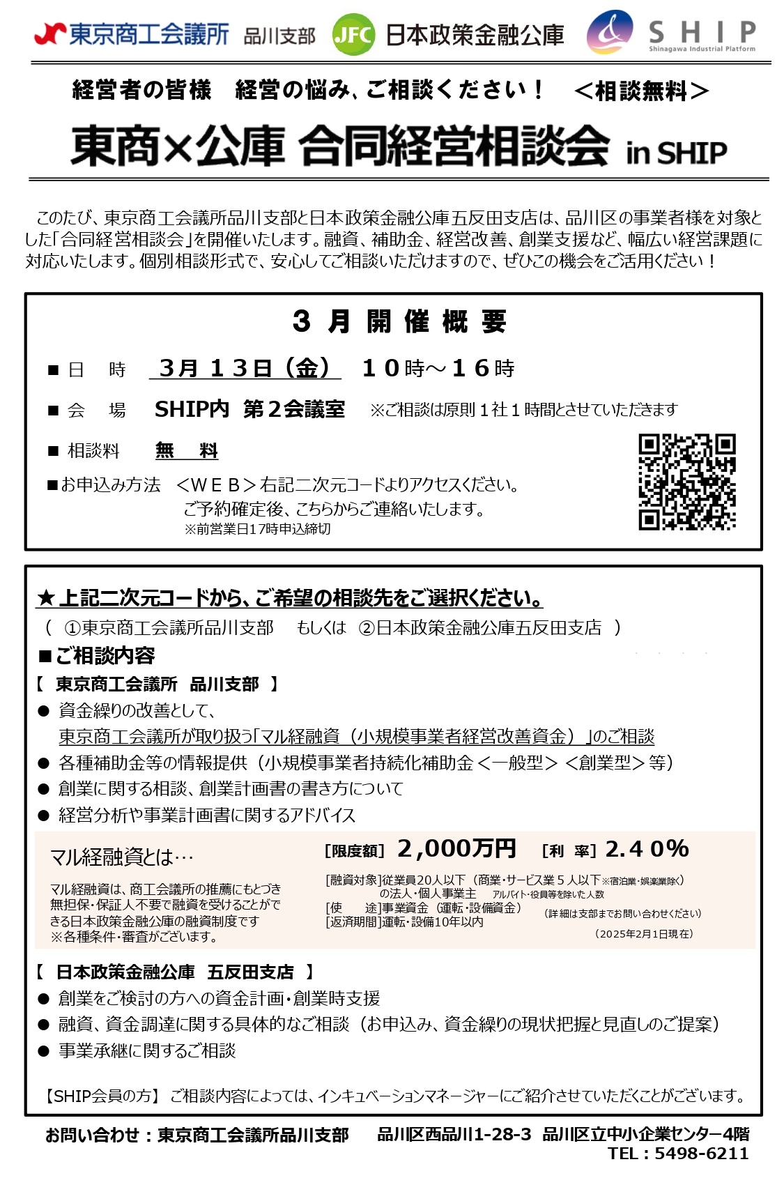 3月13日(金)東商×公庫 合同経営相談会 in SHIP(東京商工会議所品川支部、日本政策金融公庫五反田支店 連携相談会)