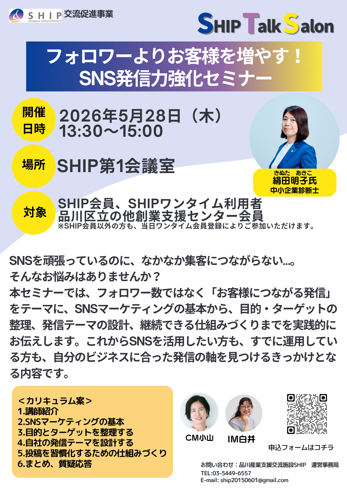 2026年5月のSHIP Talk Salonは「フォロワーよりお客様を増やす!SNS発信力強化」をテーマに開催します。
