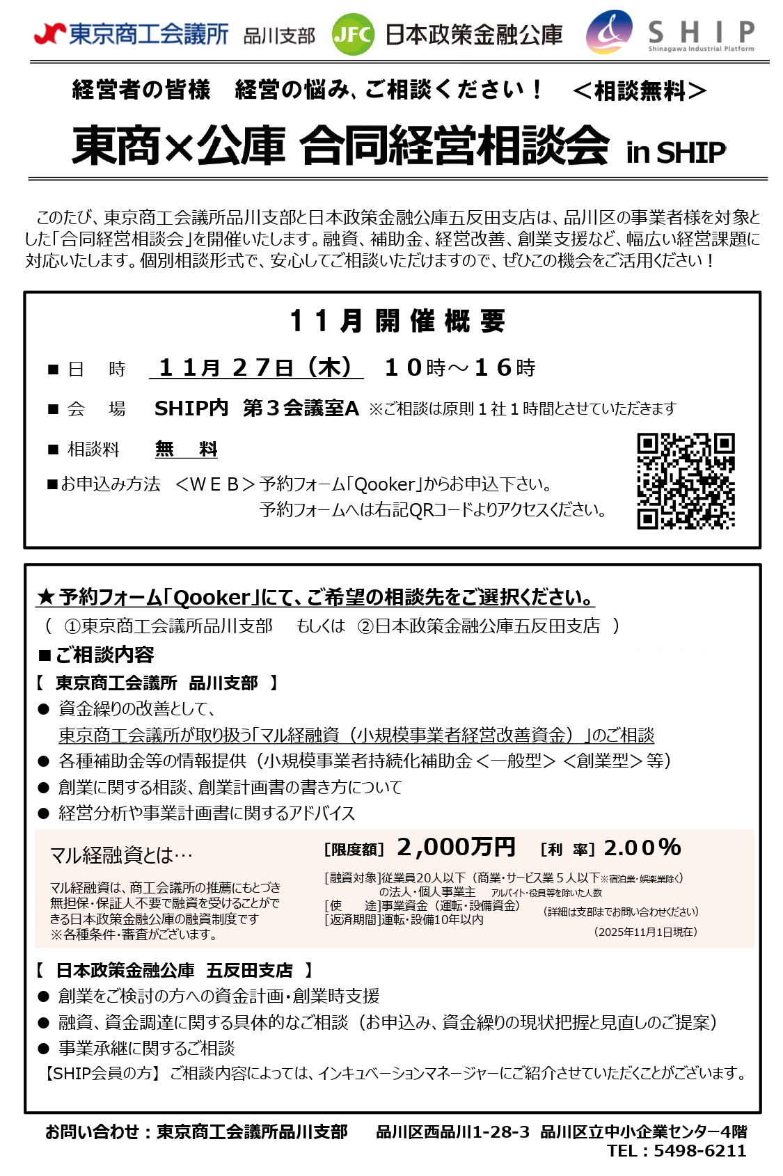 このたび、東京商工会議所品川支部と日本政策金融公庫五反田支店は、品川区の事業者様を対象とした「合同経営相談会 in SHIP」を開催いたします。