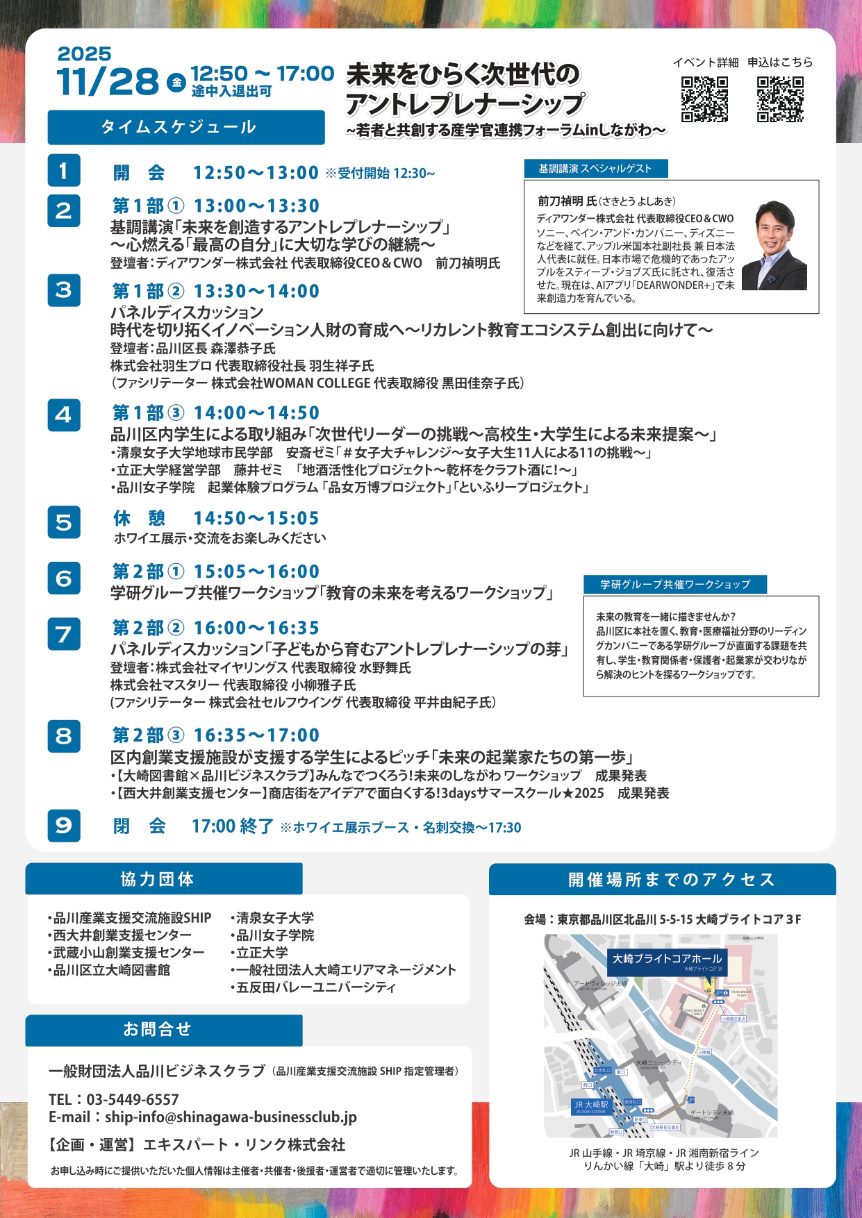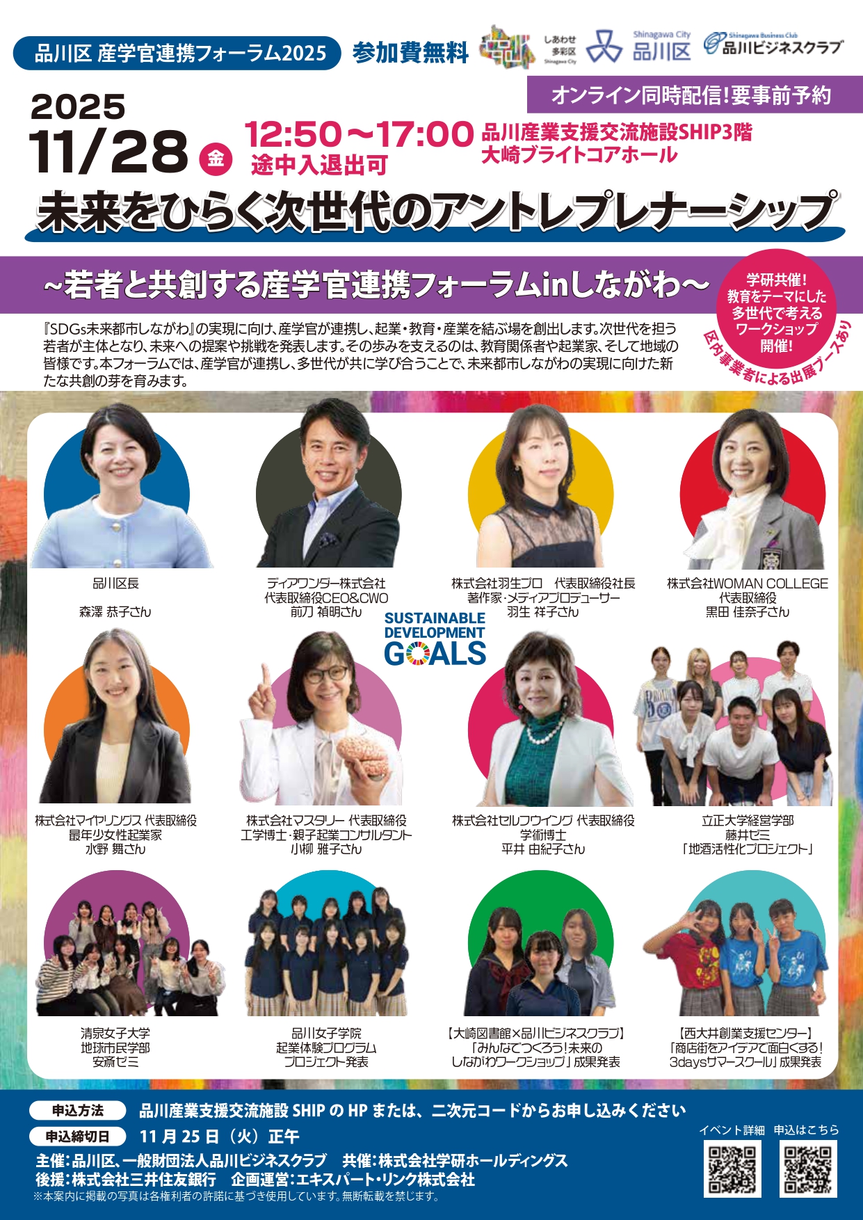 11月28日(金)品川区産学官連携フォーラム2025開催!未来をひらく次世代のアントレプレナーシップ~若者と共創する産学官連携フォーラムinしながわ~