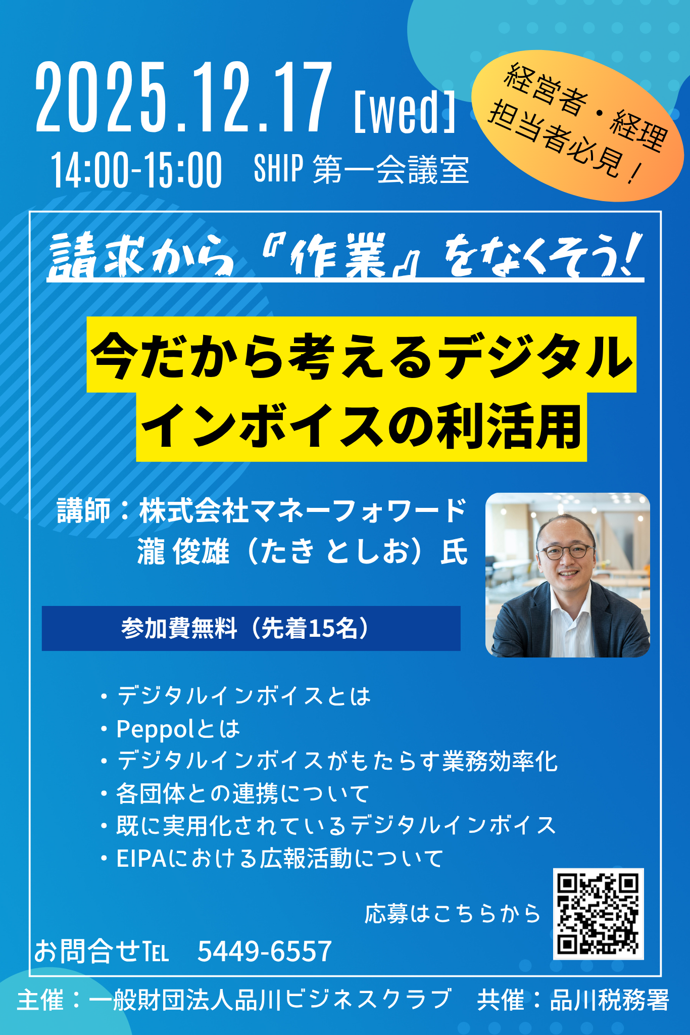 2025年12月17日(水)に開催される「請求から『作業』をなくそう!今だから考えるデジタルインボイスの利活用」(一般財団法人品川ビジネスクラブ主催、品川税務署共催)のお知らせです。