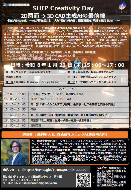 1月22日(木)開催!SHIP Creativity Day「2D図面→ 3D CAD生成AIの最前線」